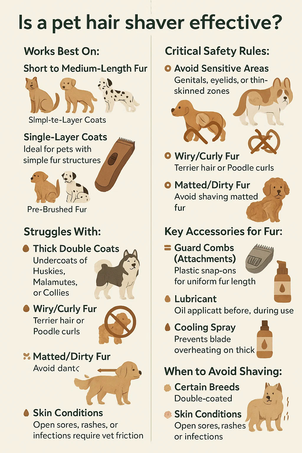 Da, a brijač za kućne ljubimce (koji se nazivaju i kućnim ljubimcima ili trimerima) posebno je dizajniran za rad na krznu životinje, ali učinkovitost ovisi o tipu krzna, kvaliteti alata i tehnici. Ispod je detaljan slom: