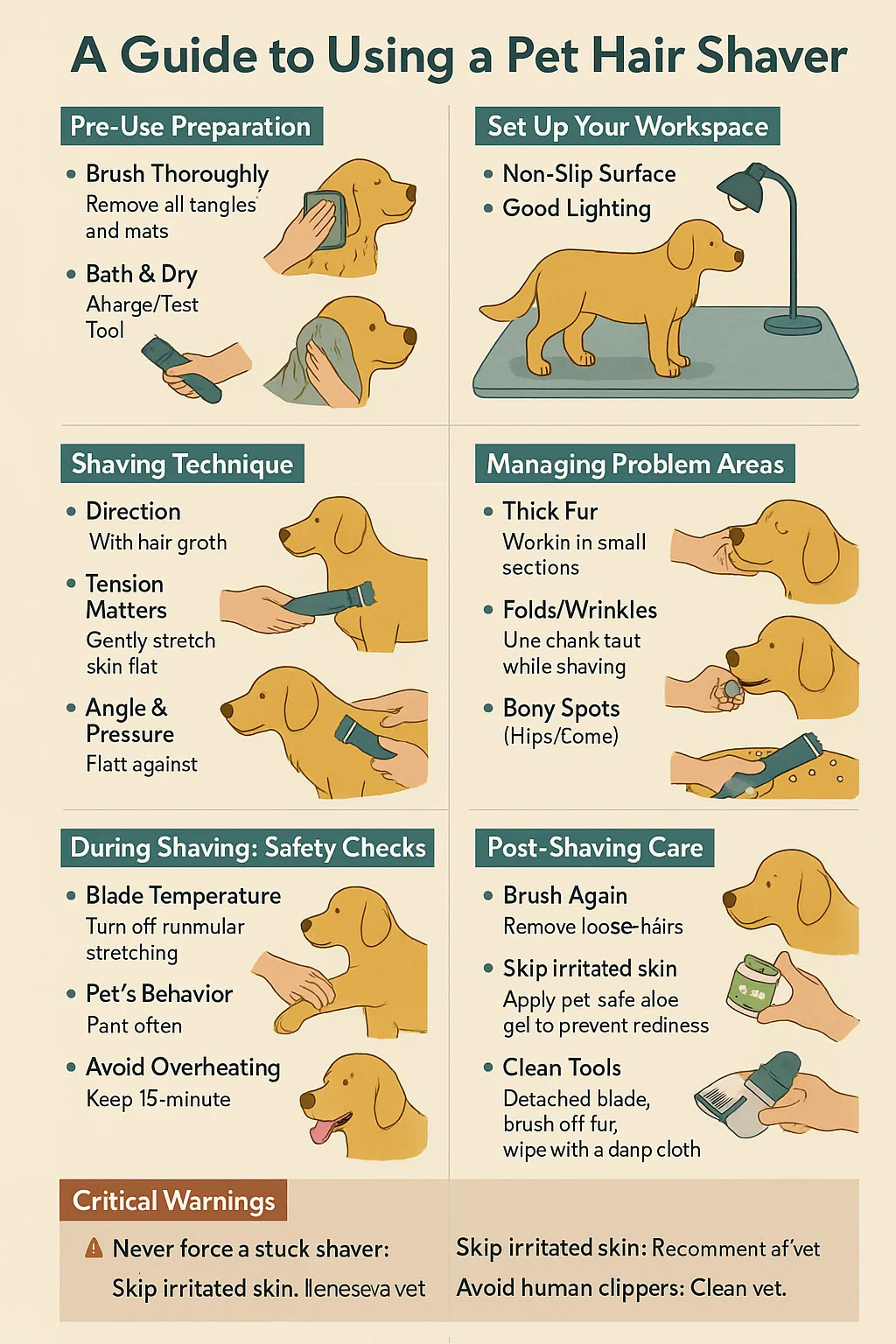Korištenje a brijač za kućne ljubimce Sigurno i učinkovito zahtijeva pripremu, tehniku i skrb. Evo detaljnog, detaljnog vodiča: