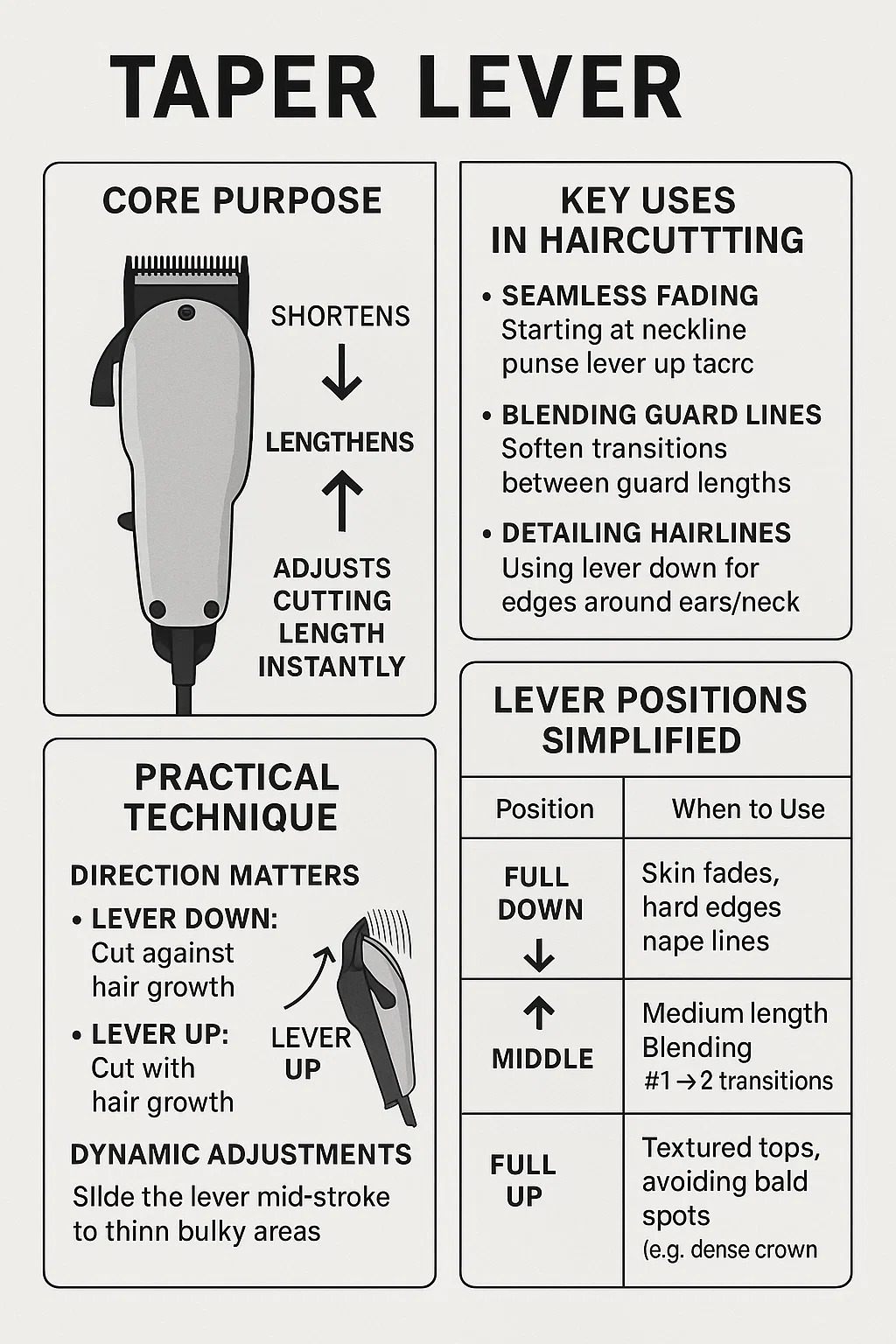 Skraćuje kosu kad se gurne prema dolje (↓): Oštrice se približavaju, režući kosu bliže vlasištu. Koristi se za uske izblijede ili oštre rubove.